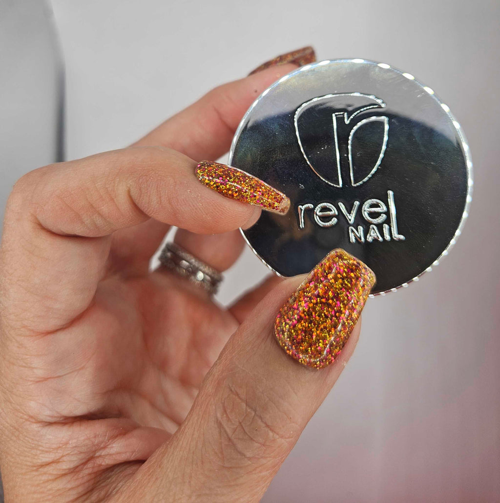 A vivid glitter bomb packed with a mix of gold, orange, and magenta micro and medium glitters for a full-coverage, high-sparkle finish.