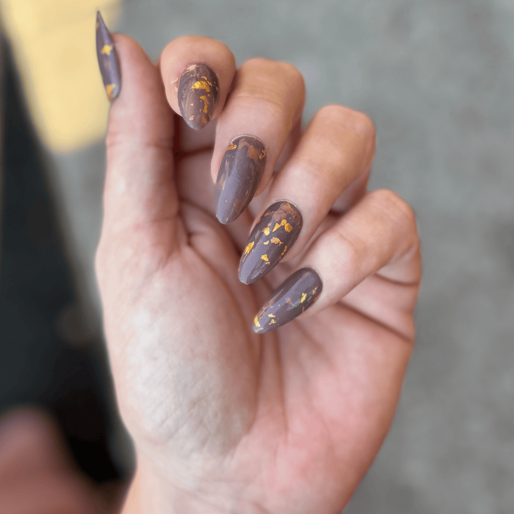 Golden Fig is a warm medium brown color with pink and gray undertones and large gold flakes.