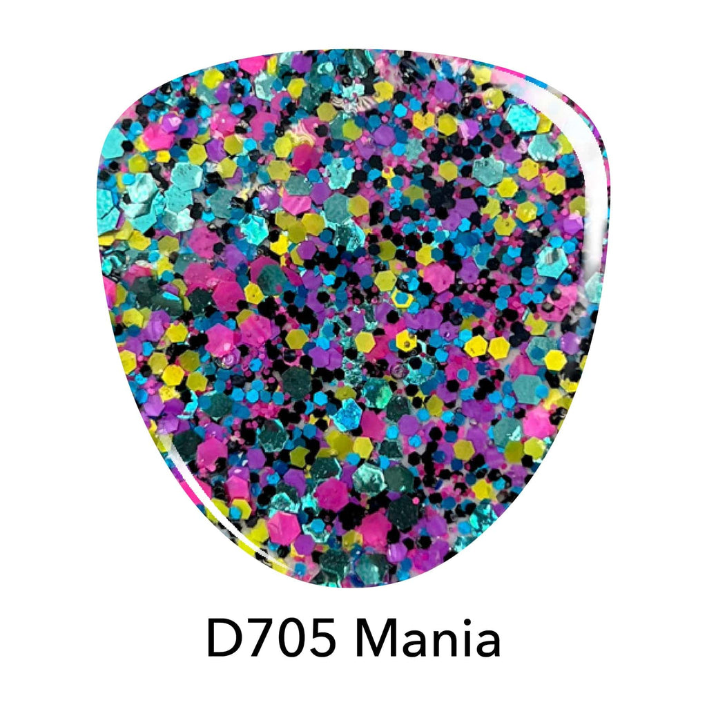 Chunky glitters can be a little tricky to work with but adding a layer of D75 Vivien (Clear) make your manicure a breeze. After each dip of Mania, gently press the chunky glitters flat with your finger.