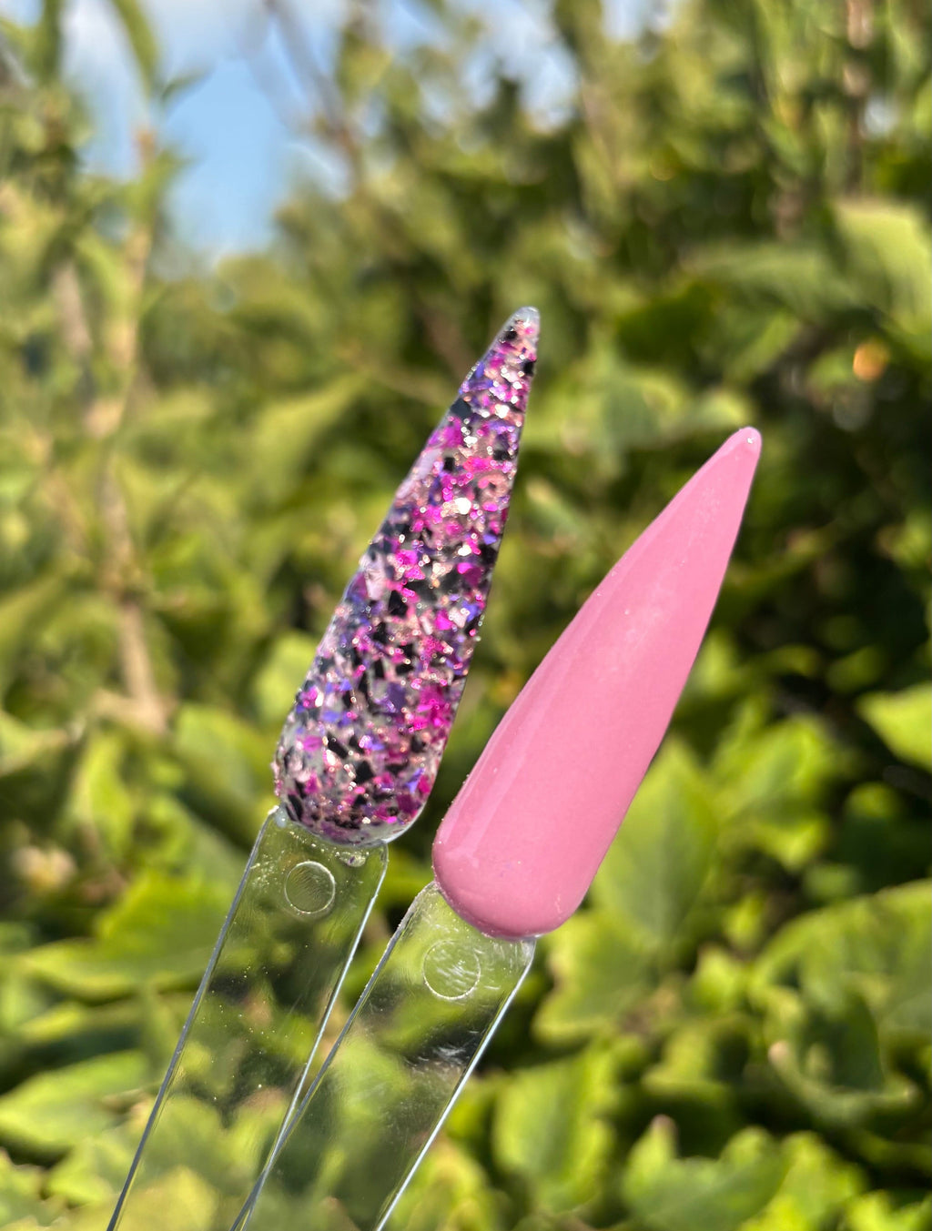 Afterlight is a vibrant, jewel-toned mix of bold flakes that include vivid fuchsia, electric violet, and fiery rose gold. The metallic shards catch the light dramatically, creating a rich, multidimensional sparkle.