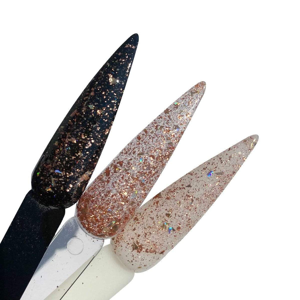Flakes are a bit different than the typical glitters you'll find in Dip Powder. Flakes are well, flakey. They're a new way to add a dimension and a bit of multifaceted glitz to your manicure. Flakes need a little extra care when it comes time for buffing, so don't hesitate to add an extra layer of D75 Vivien (Clear) (or two) when adding flakes to your manicure. To help your flakes add the most 'wow' factor to your mani, gently tap the side of the jar each time prior to dipping. This helps loosen the flakes and brings them to top so they're ready to be picked up by your Pro Base.